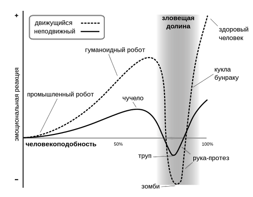 Когда сходство машины и человека возрастает до критической точки, очень близкой к человеческой, возникает так называемая «долина» сильных негативных чувств сродни тем, которые провоцируются у человека видом трупов или зомби.