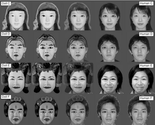 При помощи таких изображений ученые измеряют взаимосвязь между степенью нашего недоверия к «околочеловеческим» существам и их внешнему виду (например, размеру глаз). | Источник: Seyama, J., & Nagayama, R. S. (2007). The Uncanny Valley: Effect of Realism on the Impression of Artificial Human Faces. Presenc